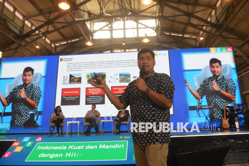 Manager Akuisisi Pelanggan dan Green Energy PLN Fikri Praditya menyampaikan paparan saat Panel Discussion III: EBT Mulai Hari Ini! Skenario Pengembangan Energi Baru dan Terbarukan dalam acara Rembuk Energi dan Hilirisasi 2025 di Pos Bloc, Jakarta, Rabu (10/12/2025). Rembuk Energi dan Hilirisasi 2025 merupakan forum yang ditujukan untuk mendekatkan isu hilirisasi dan transisi energi kepada generasi muda melalui pendekatan kreatif dan inklusif. Acara ini mengusung tema besar Refleksi Tata Kelola Hilirisasi: Energi Masa Depan Indonesia. (FOTO : Republika/Prayogi)