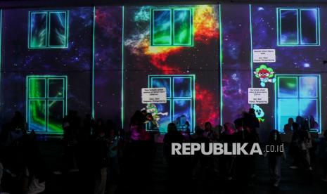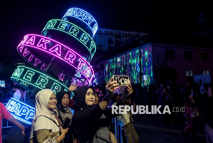 REPUBLIKA.CO.ID, JAKARTA -- Warga menikmati sajian instalasi pencahayaan dalam Jakarta Light Festival 2025 di kawasan Kota Tua, Jakarta, Selasa (30/12/2025).