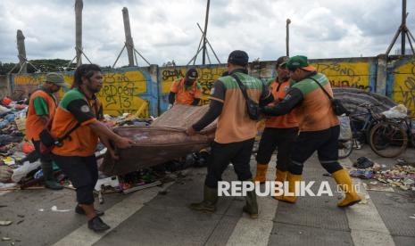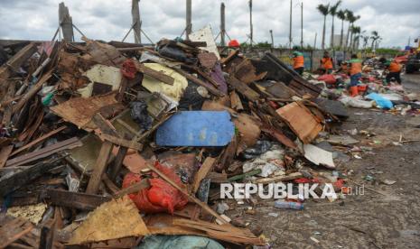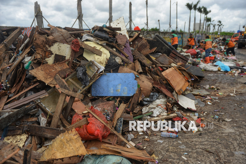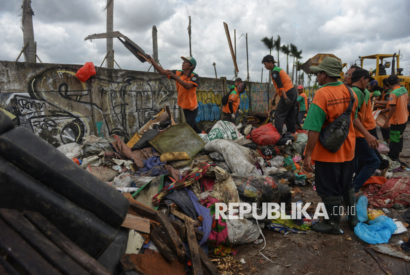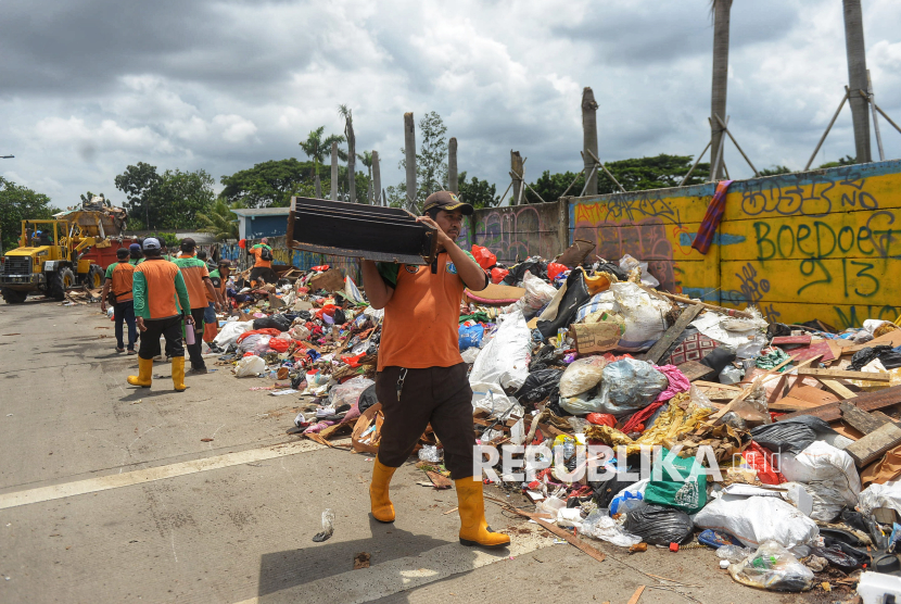 Petugas mengumpulkan sampah sisa banjir yang berasal dari wilayah permukiman kawasan Rawa Buaya di Jalan Inspeksi Kali Mookervart, Daan Mogot, Jakarta, Senin (26/1/2026). Sampah sisa banjir tersebut tidak hanya berupa limbah plastik rumah tangga, tetapi juga didominasi perabotan berukuran besar yang rusak akibat terendam air. Saat ini, upaya penanganan sampah pascabanjir terus dikebut, dengan petugas tampak bahu-membahu di lokasi. Sampah rumah tangga selanjutnya dibuang ke Tempat Pengolahan Sampah Terpadu (TPST) Bantar Gebang, sementara sampah berukuran besar, seperti sofa, kasur, lemari, meja, kayu, dan material lainnya, dibawa ke Saringan Sampah TB Simatupang (SSTBS). (FOTO : Republika/Prayogi)