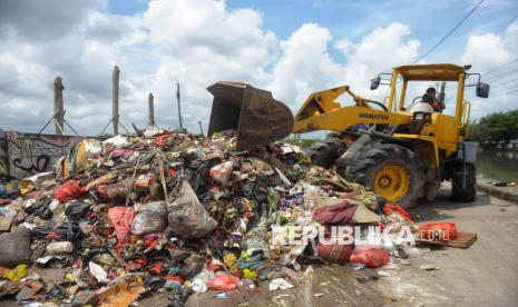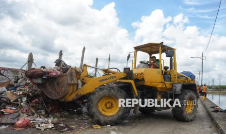 Petugas dengan menggunakan alat berat mengumpulkan sampah sisa banjir yang berasal dari wilayah permukiman kawasan Rawa Buaya di Jalan Inspeksi Kali Mookervart, Daan Mogot, Jakarta, Senin (26/1/2026). Sampah sisa banjir tersebut tidak hanya berupa limbah plastik rumah tangga, tetapi juga didominasi perabotan berukuran besar yang rusak akibat terendam air. Saat ini, upaya penanganan sampah pascabanjir terus dikebut, dengan petugas tampak bahu-membahu di lokasi. Sampah rumah tangga selanjutnya dibuang ke Tempat Pengolahan Sampah Terpadu (TPST) Bantar Gebang, sementara sampah berukuran besar, seperti sofa, kasur, lemari, meja, kayu, dan material lainnya, dibawa ke Saringan Sampah TB Simatupang (SSTBS). (FOTO : Republika/Prayogi)