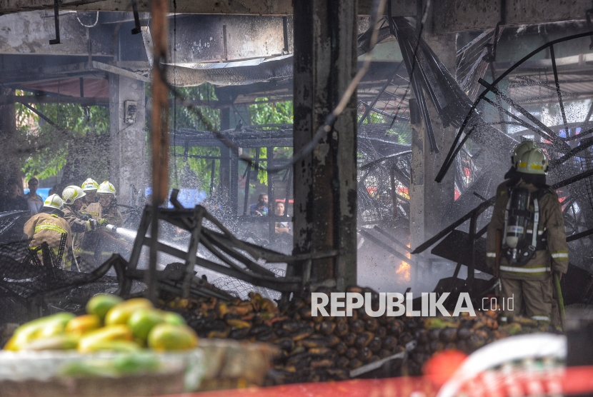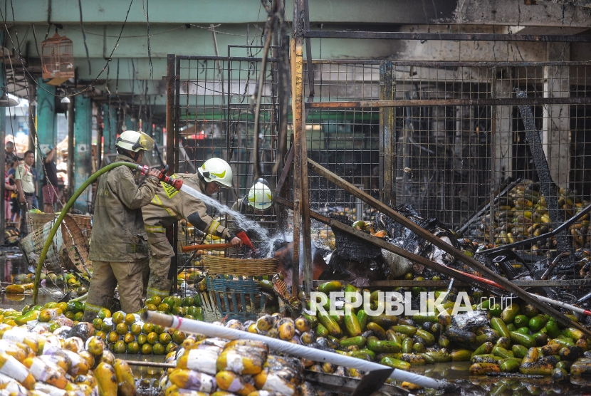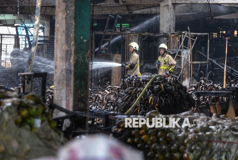 Petugas pemadam kebakaran memadamkan sisa api di kios los buah pepaya Pasar Induk Kramat Jati, Jakarta, Senin (15/12/2025). Kebakaran melanda los pepaya di Pasar Induk Kramat Jati, tersebut terjadi sekitar pukul 07.15 WIB. Material dagangan yang mudah terbakar diduga membuat api cepat membesar dan merambat ke lapak-lapak lainnya. Akibat peristiwa tersebut, sedikitnya 350 lapak pedagang hangus dilalap si jago merah. Untuk memadamkan api dan mencegah kebakaran meluas, petugas mengerahkan 19 unit mobil pemadam kebakaran dengan dukungan 95 personel ke lokasi kejadian. Hingga saat ini, api berhasil dikendalikan dan sudah padam. (FOTO : Republika/Prayogi)