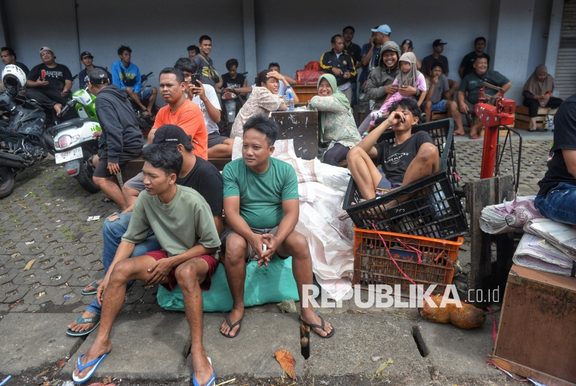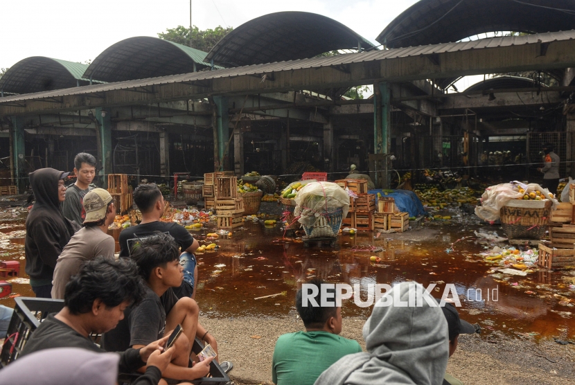 Pedagang melihat kebakaran yang terjadi di kios los buah pepaya Pasar Induk Kramat Jati, Jakarta, Senin (15/12/2025). Kebakaran melanda los pepaya di Pasar Induk Kramat Jati, tersebut terjadi sekitar pukul 07.15 WIB. Material dagangan yang mudah terbakar diduga membuat api cepat membesar dan merambat ke lapak-lapak lainnya. Akibat peristiwa tersebut, sedikitnya 350 lapak pedagang hangus dilalap si jago merah. Untuk memadamkan api dan mencegah kebakaran meluas, petugas mengerahkan 19 unit mobil pemadam kebakaran dengan dukungan 95 personel ke lokasi kejadian. Hingga saat ini, api berhasil dikendalikan dan sudah padam. (FOTO : Republika/Prayogi)