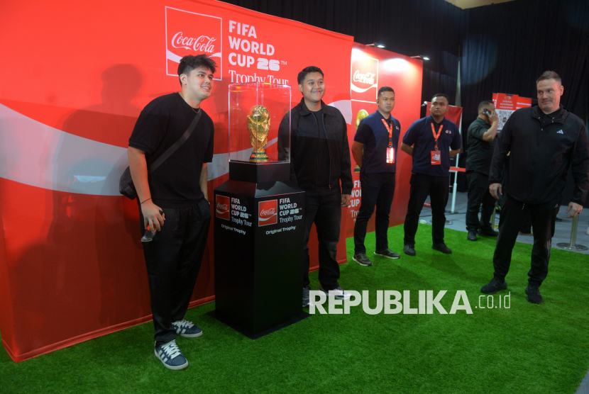 Sejumlah orang mengantri untuk bisa berfoto dengan original trofi Piala Dunia saat acara FIFA World Cup 2026 Trophy Tour di Jakarta Internasional Convention Center (JICC) , Kamis (22/1/2026). Indonesia menjadi salah satu dari sedikit negara di Asia Tenggara yang disinggahi dalam tur global ini. (FOTO : Republika/Prayogi)