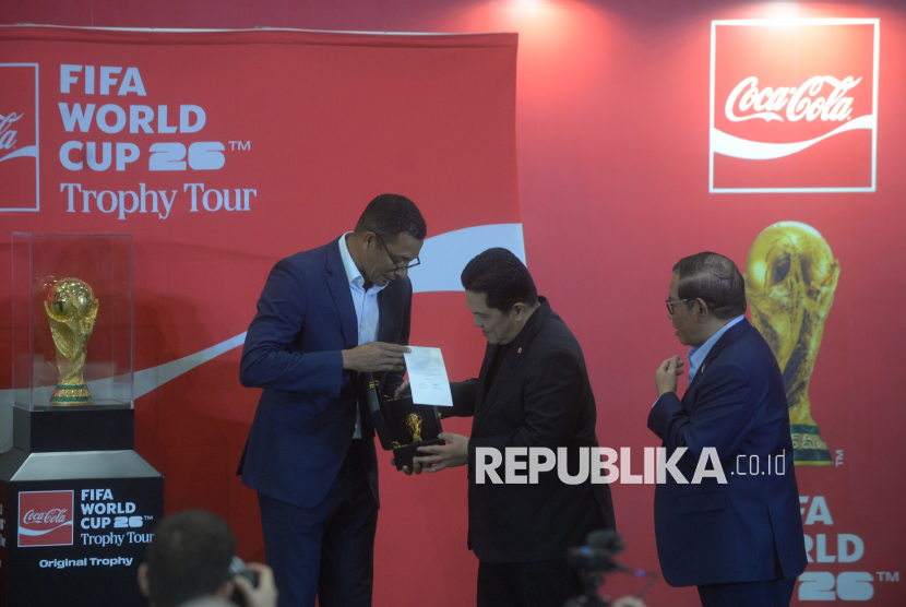 President Director Coca-Cola Indonesia Eva Lusiana, President ASEAN & South Pacific The Coca-Cola Company Selman Careaga, The FIFA Football Legend Gilberto Silva, Gubernur Jakarta Pramono Anung dan Menteri Pemuda dan Olahraga Erick Thohir (dari kiri) saat menghadiri acara FIFA World Cup 2026 Trophy Tour di Jakarta Internasional Convention Center (JICC) , Kamis (22/1/2026). FIFA World Cup 2026 Trophy Tour by Coca-Cola ini menghadirkan trofi asli Piala Dunia FIFA ke Jakarta. (FOTO : Republika/Prayogi)