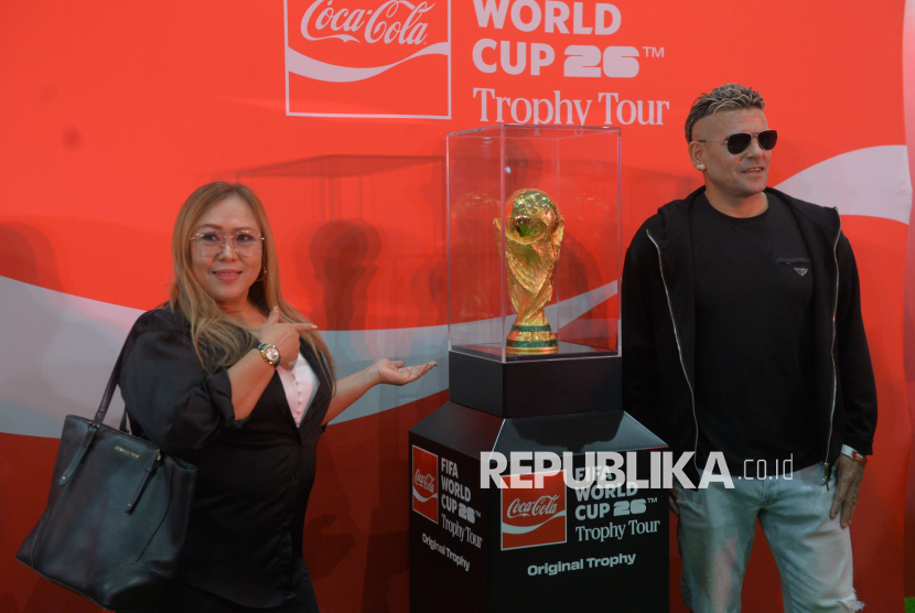 Tamu undangan berfoto bersama original trofi Piala Dunia saat acara FIFA World Cup 2026 Trophy Tour di Jakarta Internasional Convention Center (JICC) , Kamis (22/1/2026). FIFA World Cup 2026 Trophy Tour by Coca-Cola ini menghadirkan trofi asli Piala Dunia FIFA ke Jakarta dan memberikan kesempatan istimewa bagi pecinta sepak bola Indonesia untuk menyaksikan secara langsung trofi paling prestisius di dunia menjelang FIFA World Cup 2026. (FOTO : Republika/Prayogi)