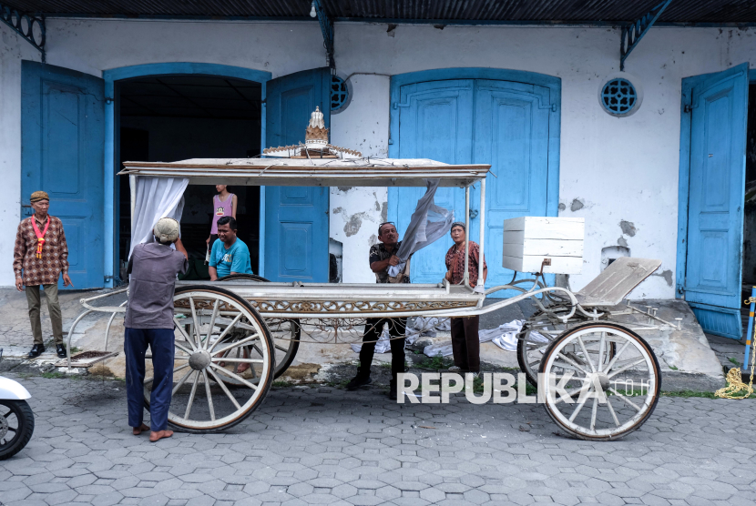 Abdi dalem keraton menyiapkan Kereta Pusaka Pralaya untuk digunakan membawa jenazah Raja Keraton Kasunanan Surakarta Hadiningrat Sri Susuhunan Paku Buwana XIII di Solo, Jawa Tengah, Ahad (2/11/2025). Paku Buwana XIII meninggal dunia pada usia 77 tahun dan akan dimakamkan di Astana Raja-raja Mataram Imogiri, Yogyakarta pada Rabu (5/11/2025) mendatang. (FOTO : ANTARAFOTO/Maulana Surya)