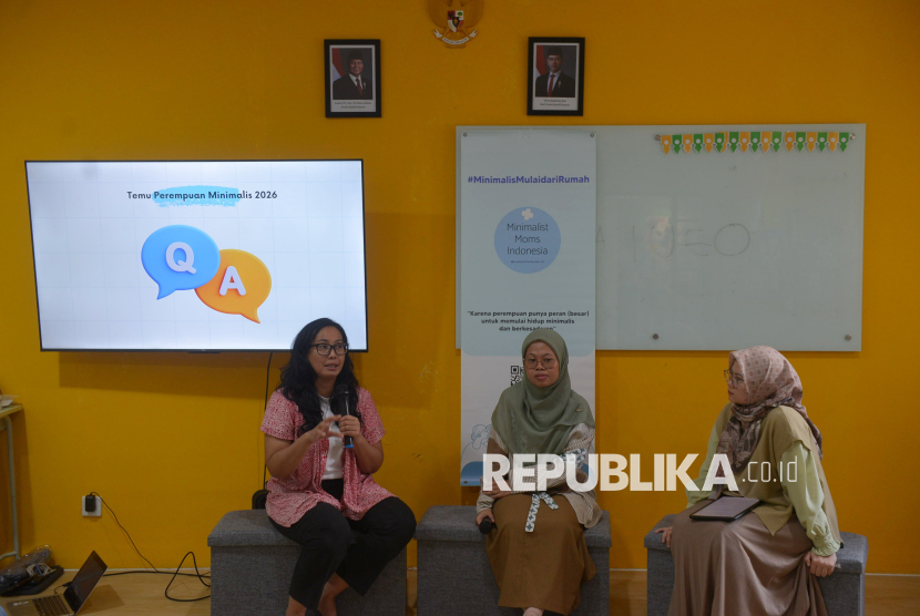 Praktisi Sustainable Living Nada Arini, Founder Bersi Bersi Lemari & Teman Hebat Berkarya Aisyah Winna dan Jurnalis Republika Lida P (dari kiri) saat talkshow dalam acara Temu Perempuan Minimalis di Sekolah Murid Merdeka, Pesanggrahan, Jakarta, Ahad (25/1/2026). Sesi talkshow dalam acara temu perempuan minimalis ini membahas sekaligus menjadi ruang belajar bersama mengenai upaya mengurangi limbah fesyen, mulai dari bijak membeli, bijak memakai, hingga bijak membuang. Temu Perempuan Minimalis merupakan acara tahunan yang diselenggarakan oleh Minimalist Moms Indonesia, sebuah komunitas perempuan,baik yang sudah menikah maupun belum, yang sedang belajar menerapkan gaya hidup minimalis, dimulai dari rumah dalam keseharian dan pengasuhan. Selain talkshow, acara Temu Perempuan Minimalis juga diisi beragam kegiatan edukatif yang berfokus pada penerapan gaya hidup minimalis, berkesadaran, serta berkelanjutan dalam keseharian. (FOTO : Republika/Prayogi)