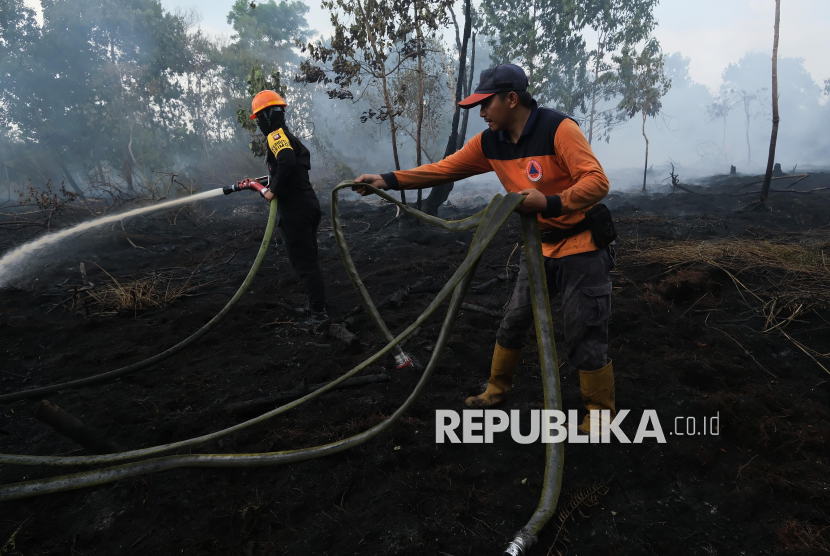 REPUBLIKA.CO.ID, KALBAR -- Personel Sat Brimob Polda Kalbar bersama petugas BPBD Kubu Raya melakukan pembasahan di lokasi kebakaran lahan gambut di Jalan Angkasa Pura, Kecamatan Sungai Raya, Kabupaten Kubu Raya, Kalimantan Barat, Sabtu (24/1/2026).