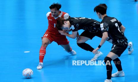Pemain Timnas futsal Indonesia Firman Adriansyah berebut bola dengan pemain Korea Selatan pada pertandingan grup A AFC Futsal Asian Cup 2026 di Indonesia Arena, Senayan, Jakarta, Selasa (27/1/2026). Timnas futsal Indonesia mengalahkan timnas futsal Korea Selatan dengan skor 5-0. (FOTO : Edwin Putranto/Republika)