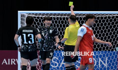 Pemain Timnas futsal Indonesia Kak Jukwang mendapat kartu kuning dari wasit seusai melakukan pelanggaran terhadap pemain Indonesia pada pertandingan grup A AFC Futsal Asian Cup 2026 di Indonesia Arena, Senayan, Jakarta, Selasa (27/1/2026). Timnas futsal Indonesia mengalahkan timnas futsal Korea Selatan dengan skor 5-0. (FOTO : Edwin Putranto/Republika)