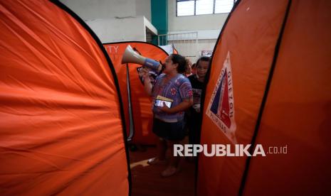 Petugas memberikan pengumuman dari pengeras suara di lokasi pengungsian saat Topan Fung-wong melanda kota Quezon, Filipina, Ahad (9/11/2025). Lebih dari 1.149 orang telah dievakuasi ke tempat pengungsian di Kota Quezon akibat Topan Super Fung-wong yang membawa angin kencang dan hujan deras ke beberapa wilayah di negara tersebut. Para pengungsi berlindung di delapan pusat evakuasi. (FOTO : AP Photo/Aaron Favila)