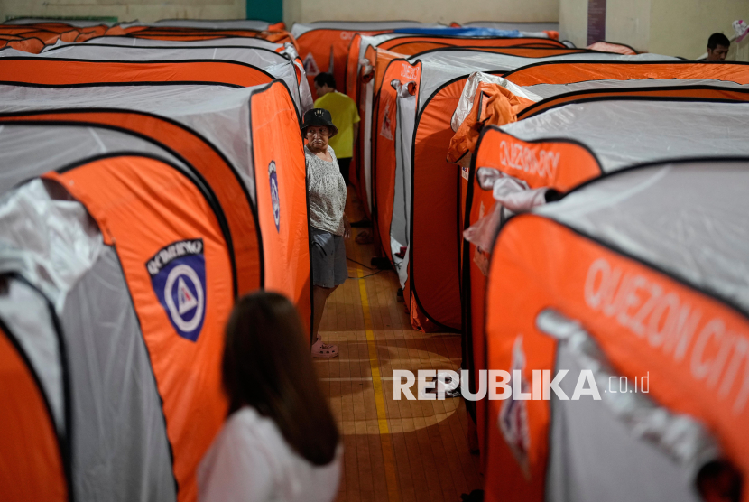 Warga berada di dalam tenda pengungsian saat Topan Fung-wong melanda kota Quezon, Filipina, Ahad (9/11/2025). Lebih dari 1.149 orang telah dievakuasi ke tempat pengungsian di Kota Quezon akibat Topan Super Fung-wong yang membawa angin kencang dan hujan deras ke beberapa wilayah di negara tersebut. Para pengungsi berlindung di delapan pusat evakuasi. (FOTO : AP Photo/Aaron Favila)