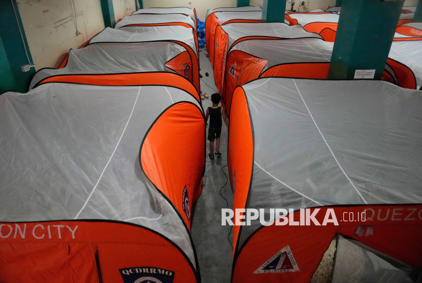 Seorang anak berjalan di antara tenda pengungsian saat Topan Fung-wong melanda kota Quezon, Filipina, Ahad (9/11/2025). Lebih dari 1.149 orang telah dievakuasi ke tempat pengungsian di Kota Quezon akibat Topan Super Fung-wong yang membawa angin kencang dan hujan deras ke beberapa wilayah di negara tersebut. Para pengungsi berlindung di delapan pusat evakuasi. (FOTO : AP Photo/Aaron Favila)