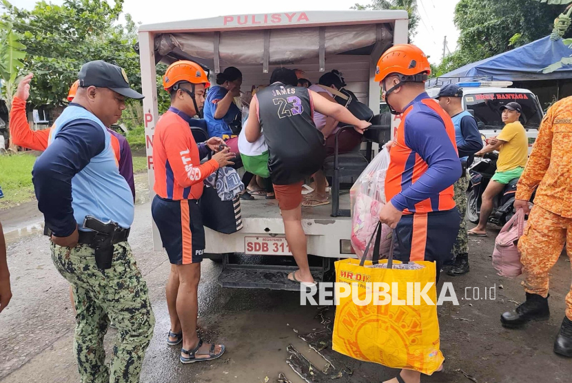 Petugas mengevakuasi warga ke lokasi pengungsian saat Topan Fung-wong melanda kota Quezon, Filipina, Ahad (9/11/2025). Lebih dari 1.149 orang telah dievakuasi ke tempat pengungsian di Kota Quezon akibat Topan Super Fung-wong yang membawa angin kencang dan hujan deras ke beberapa wilayah di negara tersebut. Para pengungsi berlindung di delapan pusat evakuasi. (FOTO : Philippine Coast Guard via AP)