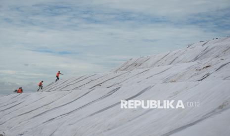 Pekerja berjalan di atas tumpukan sampah yang dilapisi dengan tanah dan geotextile di TPA Jatiwaringin KabupatenTangerang, Banten, Jumat (24/10/2025). Kementerian Lingkungan Hidup meminta seluruh TPA yang masih menggunakan sistem open dumping di wilayah Jabodetabek untuk segera melakukan capping atau penutupan tumpukan sampah guna mencegah pencemaran lingkungan dan penyebaran mikroplastik. (FOTO : ANTARA FOTO/Putra M. Akbar)