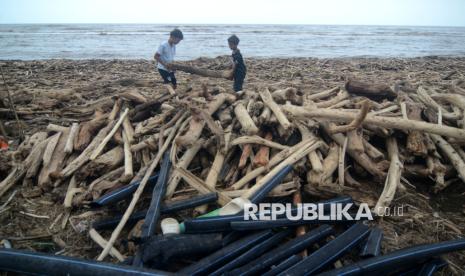 Sejumlah anak mengumpulkan kayu yang terdampar di Pantai Utara Desa Larangan, Kabupaten Tegal, Jawa Tengah, Senin (26/1/2026). Sampah berbagai macam kayu gelondongan diantaranya sengon dan mahoni itu menumpuk di sepanjang pantai Utara terbawa arus pascabanjir bandang dari Gunung Slamet. (FOTO : ANTARA FOTO/Oky Lukmansyah)