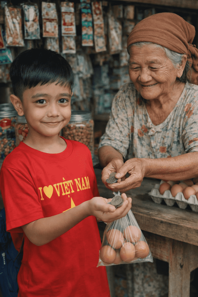 Seorang anak sedang menerima uang receh kembalian dari seorang nenek penjual telur. (Sumber: Copilot)