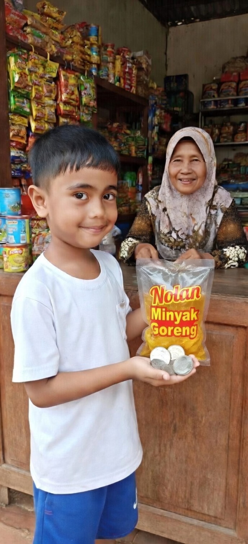 Menerima uang kembalian pembelian minyak goreng. (Sumber: GrokAI)