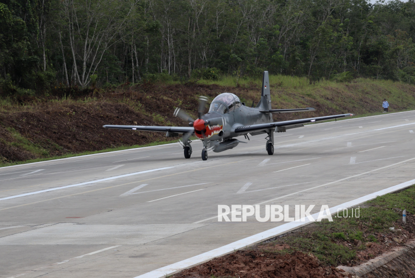 Pesawat tempur Super Tucano melakukan uji coba pendaratan di Jalan Tol Trans Sumatera (JTTS) ruas Jalan Tol Terbanggi Besar–Pematang Panggang–Kayu Agung (Terpeka) di Lampung, Rabu (11/2/2026). Dua pesawat tempur milik TNI Angkatan Udara (AU) yaitu F16 dan Super Tucano melakukan uji coba pendaratan di JTTS ruas Terpeka, Lampung dalam rangka penguatan kesiapan operasional landasan darurat guna mendukung pertahanan negara. (FOTO : ANTARA FOTO)