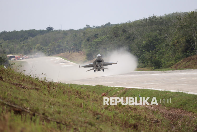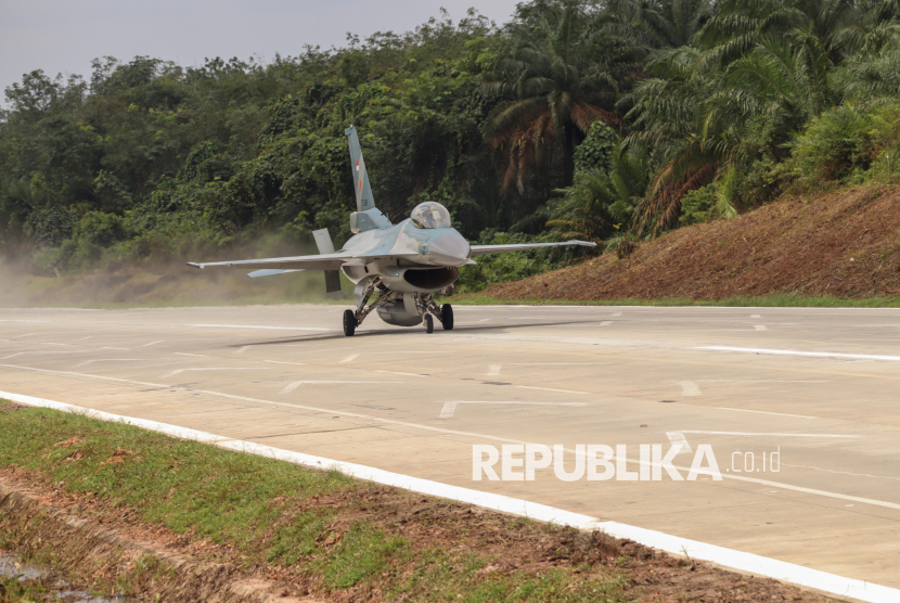REPUBLIKA.CO.ID, LAMPUNG -- Pesawat tempur F16 melakukan uji coba pendaratan di Jalan Tol Trans Sumatera (JTTS) ruas Jalan Tol Terbanggi Besar–Pematang Panggang–Kayu Agung (Terpeka) di Lampung, Rabu (11/2/2026).