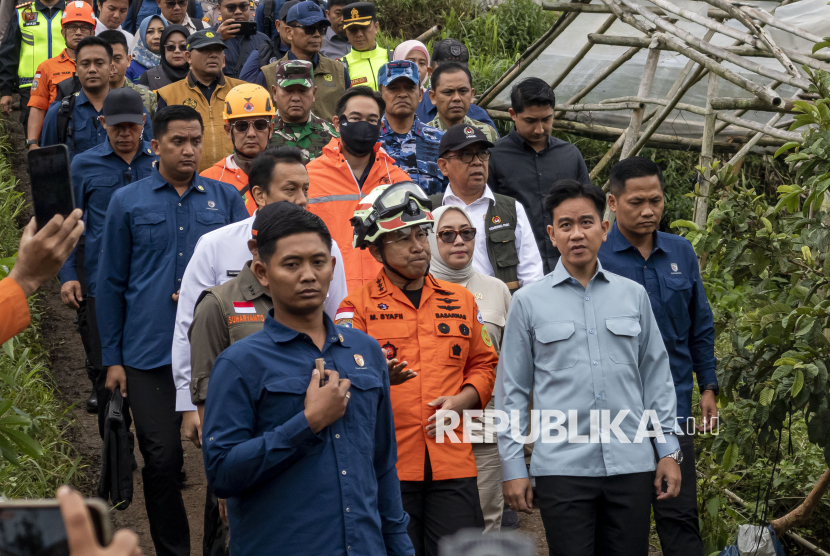 Wakil Presiden Gibran Rakabuming Raka (kedua kanan) bersama Kepala Basarnas Marsekal Madya TNI Mohammad Syafii (kedua kiri) berjalan menuju lokasi bencana tanah longsor di Desa Pasirlangu, Cisarua, Kabupaten Bandung Barat, Jawa Barat, Minggu (25/1/2026). Peninjauan itu untuk memastikan proses pencarian korban bencana tanah longsor dan penanganan darurat serta keselamatan warga terdampak berjalan dengan optimal. (FOTO : ANTARA FOTO/Abdan Syakura)