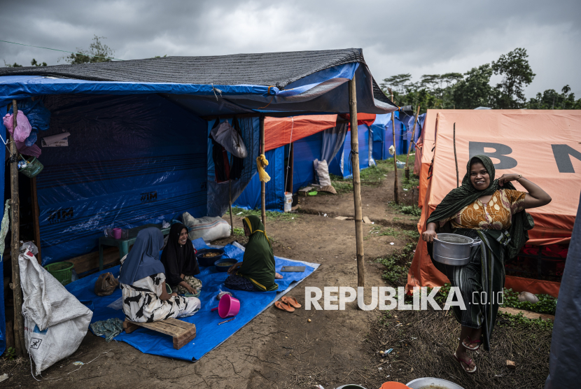 REPUBLIKA.CO.ID, ACEH -- Sejumlah anak dari Desa Gampong Gunci bermain di posko hunian darurat di Sawang, Aceh Utara, Aceh, Senin (16/2/2026).