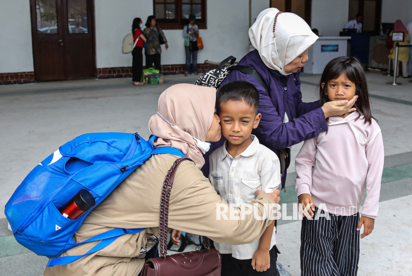 Calon penumpang kereta api jarak jauh berpamitan dengan keluarganya saat akan berangkat di Stasiun Semarang Tawang, Semarang, Jawa Tengah, Kamis (26/3/2026). Berdasarkan data PT KAI Daop 4 Semarang dari tanggal 23-26 Maret 2026 sebanyak 269.236 orang penumpang menggunakan layanan kereta api jarak jauh yang terdiri dari keberangkatan maupun kedatangan pada periode arus balik Lebaran di stasiun wilayah operasional itu, dan akan terus bertambah hingga 29 Maret 2026 yakni sebanyak 76.984 tiket telah terjual. (FOTO : ANTARA FOTO/Makna Zaezar)