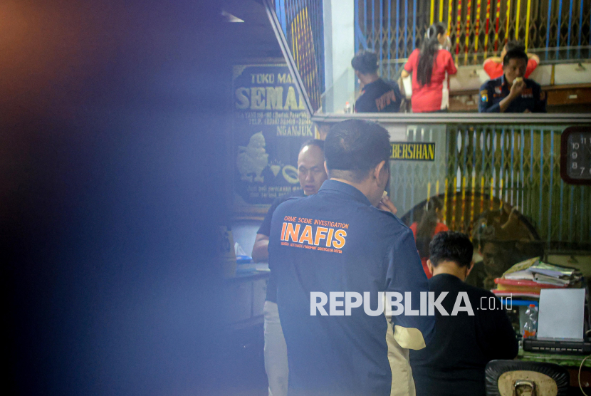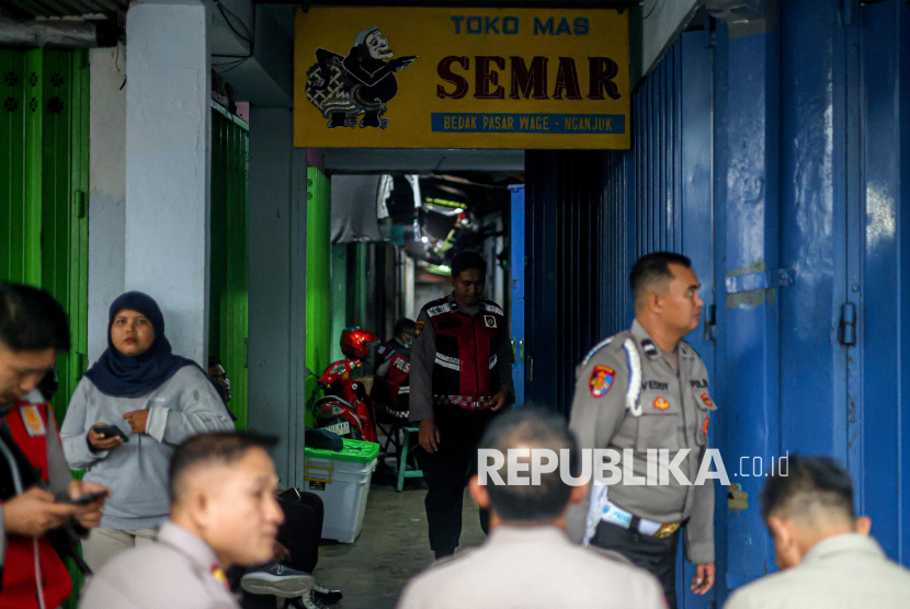 REPUBLIKA.CO.ID, NGANJUK -- Sejumlah polisi berjaga saat berlangsungnya penggeledahan di Toko Emas Semar, Nganjuk, Jawa Timur, Kamis (19/2/2026).
