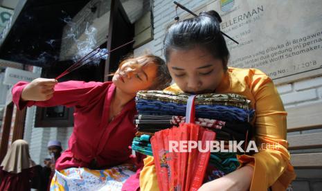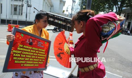 Aksi teaterikal berjudul Inggit dan Kain Batik Tan Tjoei Gin bersama komunitas Mataholang dalam rangka memperihati Hari Ulang Tahun istri pertama Presiden RI Soekarno yaitu Inggit Garnasih ke-138 dan Harmoni Imlek 2026, di kawasan Baraga, Kota Bandung, Selasa (17/2/2026). Pertunjukan tari jalanan ini sebagai sarana untuk menggambarkan hubungan persahabatan dan alkulturasi budaya antara etnis tionghoa dengan masyarakat lokal seperti pada kisah Inggit Garnasih dan pedagang kain Tan Tjoei Gin. (FOTO : Edi Yusuf)