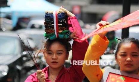 Pertunjukan teaterikal berjudul Inggit dan Kain Batik Tan Tjoei Gin bersama komunitas Mataholang dalam rangka memperihati Hari Ulang Tahun istri pertama Presiden RI Soekarno yaitu Inggit Garnasih ke-138 dan Imlek 2026, di kawasan Baraga, Kota Bandung, Selasa (17/2/2026). Pertunjukan tari jalanan ini sebagai sarana untuk menggambarkan hubungan persahabatan dan alkulturasi budaya antara etnis tionghoa dengan masyarakat lokal seperti pada kisah Inggit Garnasih dan pedagang kain Tan Tjoei Gin. (FOTO : Edi Yusuf)