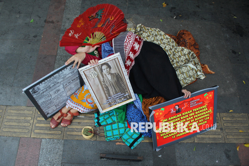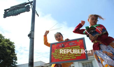 Aksi teaterikal berjudul Inggit dan Kain Batik Tan Tjoei Gin bersama komunitas Mataholang dalam rangka memperihati Hari Ulang Tahun istri pertama Presiden RI Soekarno yaitu Inggit Garnasih ke-138 dan Imlek 2026, di kawasan Baraga, Kota Bandung, Selasa (17/2/2026). Pertunjukan tari jalanan ini sebagai sarana untuk menggambarkan hubungan persahabatan dan alkulturasi budaya antara etnis tionghoa dengan masyarakat lokal seperti pada kisah Inggit Garnasih dan pedagang kain Tan Tjoei Gin. (FOTO : Edi Yusuf)