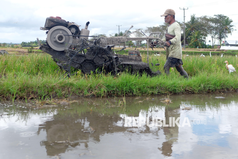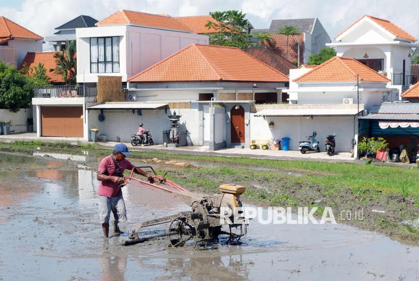 REPUBLIKA.CO.ID, BADUNG -- Seorang petani membajak sawah menggunakan traktor dengan latar belakang bangunan vila di Desa Canggu, Badung, Bali, Rabu (4/2/2026).