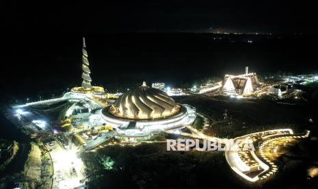 Foto udara suasana dari Masjid Negara Ibu Kota Nusantara (IKN) di Penajam Paser Utara, Kalimantan Timur, Selasa (17/2/2026). Menurut Kementerian Agama, Masjid Negara IKN dengan luas bangunan mencapai 76.647 meter persegi itu siap menggelar ibadah shalat Tarawih pertama awal Ramadhan 1447 Hijriah dengan menampung sebanyak 29.000 jamaah pada tahap pertama. (FOTO : ANTARA FOTO/M Risyal Hidayat)