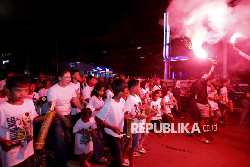 Sejumlah warga memukul kentungan bambu saat mengikuti tradisi koko o sahur di Kota Gorontalo, Gorontalo, Kamis (19/2/2026). Koko o adalah tradisi Gorontalo untuk membangunkan warga untuk sahur saat Ramadhan dengan memukul kentungan bambu secara massal dan keliling kota, serta menjadi ajang pelestarian budaya yang melibatkan ribuan warga. (FOTO : ANTARA FOTO/Adiwinata Solihin)