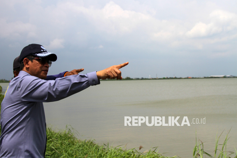 Menteri Lingkungan Hidup Hanif Faisol Nurofiq melihat kolam penampungan di tanggul lumpur Lapindo di Porong, Sidoarjo, Jawa Timur, Ahad (8/2/2026). Kementerian Lingkungan Hidup/Badan Pengendalian Lingkungan Hidup (BPLH) menyatakan akan segera menyusun Kajian Lingkungan Hidup Strategis (KLHS) dalam upaya penanganan bencana lumpur Lapindo yang saat ini masih aktif mengeluarkan lumpur panas dari dalam bumi. (FOTO : ANTARA FOTO/Umarul Faruq)
