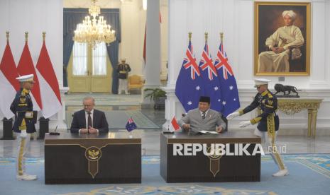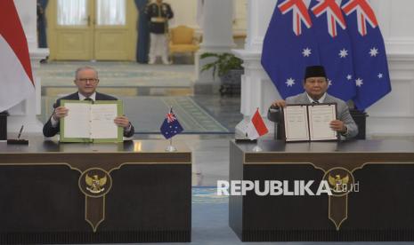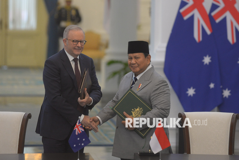 Presiden Prabowo Subianto bersama dengan Perdana Menteri Australia Anthony Albanese melakukan penandatanganan saat kunjungan kerja ke Indonesia di Istana Merdeka, Jakarta, Jumat (6/2/2026). Presiden Prabowo menerima kunjungan kerja PM Australia Anthony Albanese yang diharapkan dapat semakin memperkuat hubungan kemitraan strategis Indonesia - Australia di berbagai bidang. (FOTO : Republika/Prayogi)
