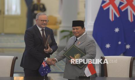 Presiden Prabowo Subianto berjabat tangan dengan Perdana Menteri Australia Anthony Albanese usai melakukan penandatanganan saat kunjungan kerja ke Indonesia di Istana Merdeka, Jakarta, Jumat (6/2/2026). Presiden Prabowo menerima kunjungan kerja PM Australia Anthony Albanese yang diharapkan dapat semakin memperkuat hubungan kemitraan strategis Indonesia - Australia di berbagai bidang. (FOTO : Republika/Prayogi)