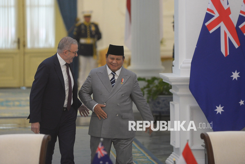 Presiden Prabowo Subianto berjalan bersama dengan Perdana Menteri Australia Anthony Albanese didampingi Seskab Tedy Indra Wijaya saat kunjungan kerja ke Indonesia di Istana Merdeka, Jakarta, Jumat (6/2/2026). Presiden Prabowo menerima kunjungan kerja PM Australia Anthony Albanese yang diharapkan dapat semakin memperkuat hubungan kemitraan strategis Indonesia - Australia di berbagai bidang. (FOTO : Republika/Prayogi)