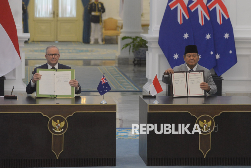 Presiden Prabowo Subianto bersama dengan Perdana Menteri Australia Anthony Albanese menunjukkan nota penandatanganan saat kunjungan kerja ke Indonesia di Istana Merdeka, Jakarta, Jumat (6/2/2026). Presiden Prabowo menerima kunjungan kerja PM Australia Anthony Albanese yang diharapkan dapat semakin memperkuat hubungan kemitraan strategis Indonesia - Australia di berbagai bidang. (FOTO : Republika/Prayogi)
