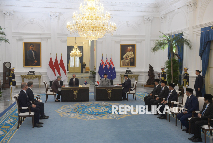 Presiden Prabowo Subianto dan Perdana Menteri (PM) Australia Anthony Albanese menyaksikan penandatanganan kerjasama antara Menteri Luar Negeri Australia Penny Wong dan Menteri Investasi dan Hilirisasi/Kepala BKPM yang juga CEO Danantara Rosan Roeslani saat kunjungan kerja ke Indonesia di Istana Merdeka, Jakarta, Jumat (6/2/2026). Presiden Prabowo menerima kunjungan kerja PM Australia Anthony Albanese yang diharapkan dapat semakin memperkuat hubungan kemitraan strategis Indonesia - Australia di berbagai bidang. (FOTO : Republika/Prayogi)