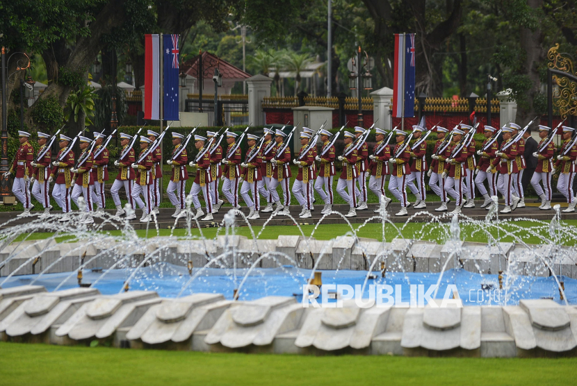 Personel Pasukan Pengamanan Presiden (Paspampres) saat mengikuti upacara penerimaan kunjungan kerja PM Australia Anthony Albanese ke Indonesia di Istana Merdeka, Jakarta, Jumat (6/2/2026). Presiden Prabowo Subianto menerima kunjungan kerja PM Australia Anthony Albanese yang diharapkan dapat semakin memperkuat hubungan kemitraan strategis Indonesia - Australia di berbagai bidang (FOTO : Republika/Prayogi)