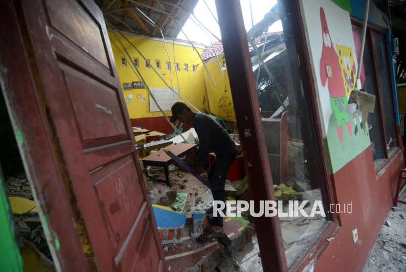 Warga berada membersihkan puing-puing bangunan sekolah taman kanak-kanak yang hancur akibat bencana tanah bergerak di Desa Padasari, Kabupaten Tegal, Jawa Tengah, Rabu (4/2/2026), Menurut data BPBD Kabupaten Tegal sebanyak 150 rumah rusak, sejumlah bangunan pondok pesantren, sekolah dan jalan rusak parah akibat bencana tanah bergerak. (FOTO : ANTARA FOTO/Oky Lukmansyah)