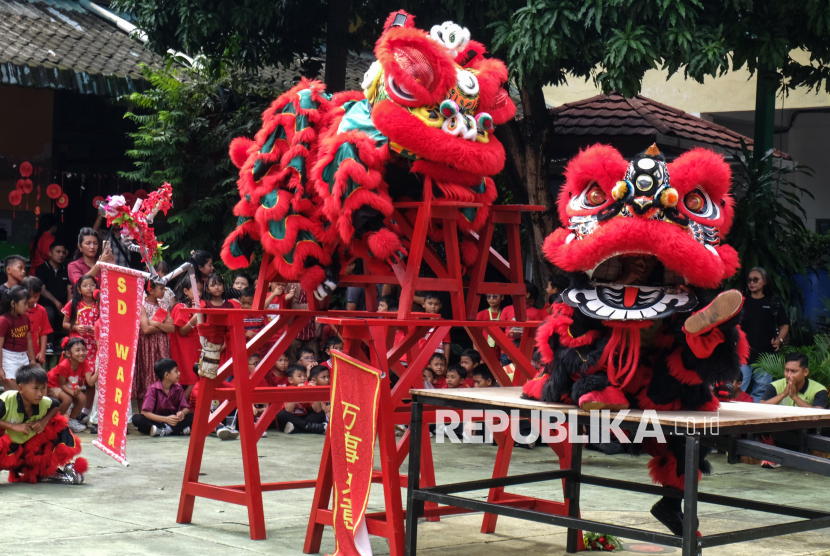 REPUBLIKA.CO.ID, SOLO -- Pemain barongsai berinteraksi dengan siswa saat pentas menyambut perayaan Imlek di SD Warga, Solo, Jawa Tengah, Selasa (10/2/2026).