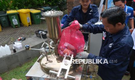 REPUBLIKA.CO.ID, DENPASAR -- Petugas menunjukkan toples kaca mini berisi energi alternatif setara bahan bakar minyak (BBM) yang diolah menggunakan mesin pirolisis saat acara bertajuk meramu energi masa depan di Denpasar, Bali, Sabtu (13/12/2025).