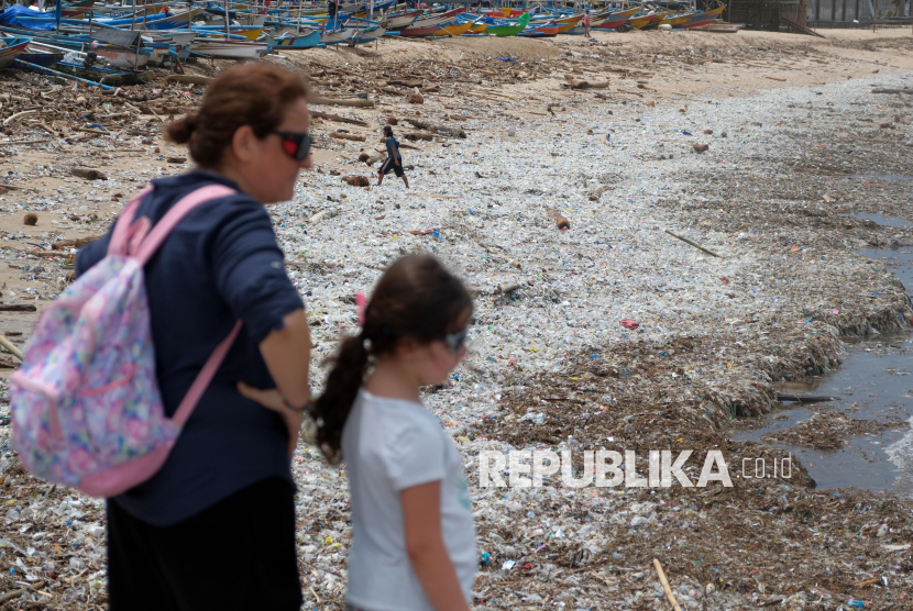 REPUBLIKA.CO.ID, BALI -- Wisatawan mancanegara melihat tumpukan sampah kiriman di Pantai Kedonganan, Badung, Bali, Kamis (26/2/2026).