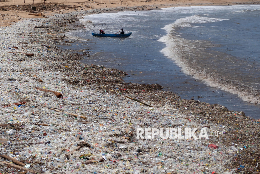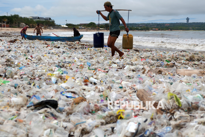 Nelayan mengangkut air melewati tumpukan sampah kiriman di Pantai Kedonganan, Badung, Bali, Kamis (26/2/2026). Menurut nelayan setempat, sejak Rabu (25/2) sampah kiriman yang didominasi sampah plastik tersebut menumpuk di objek wisata itu menyusul tingginya gelombang laut disertai angin kencang. (FOTO : ANTARA FOTO/Nyoman Hendra Wibowo)