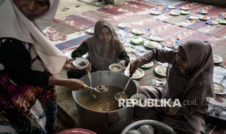 Warga membagikan masakan khas Aceh kuah beulangong dalam tradisi Meugang di dapur darurat Masjid Al-Hidayah, Desa Krueng Lingka, Langkahan, Aceh Utara, Aceh, Selasa (17/2/2026). Masyarakat Krueng Lingka melaksanakan tradisi Meugang secara sederhana melalui kegiatan memotong hewan sapi, memasak, dan makan bersama, serta berbagi daging kepada masyarakat desa setempat yang terdampak bencana hidrometeorologi. (FOTO : ANTARA FOTO/Aprillio Akbar)